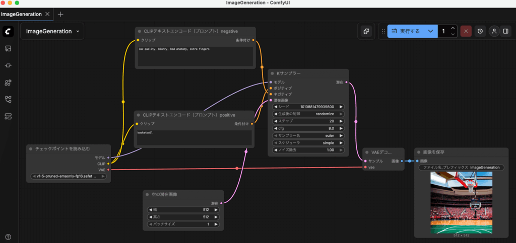 本記事ではテキストプロンプトから画像を生成するノードを自分で組み立てます